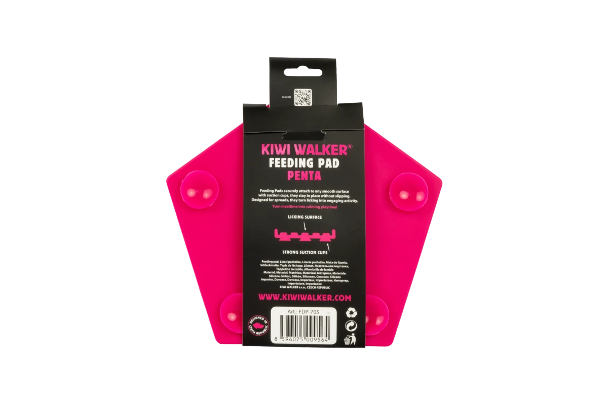 Kiwi Walker PENTA Feeding Pad Maxi w kolorze różowym to funkcjonalna mata do lizania dla psów i kotów, zaprojektowana z myślą o spowolnieniu jedzenia oraz wyciszeniu pupila. Charakterystyczna geometryczna struktura oparta na układzie pięciokątnym tworzy liczne zagłębienia o zróżnicowanej głębokości, które skutecznie zatrzymują pokarm i zachęcają zwierzę do wolniejszego, bardziej świadomego lizania.
