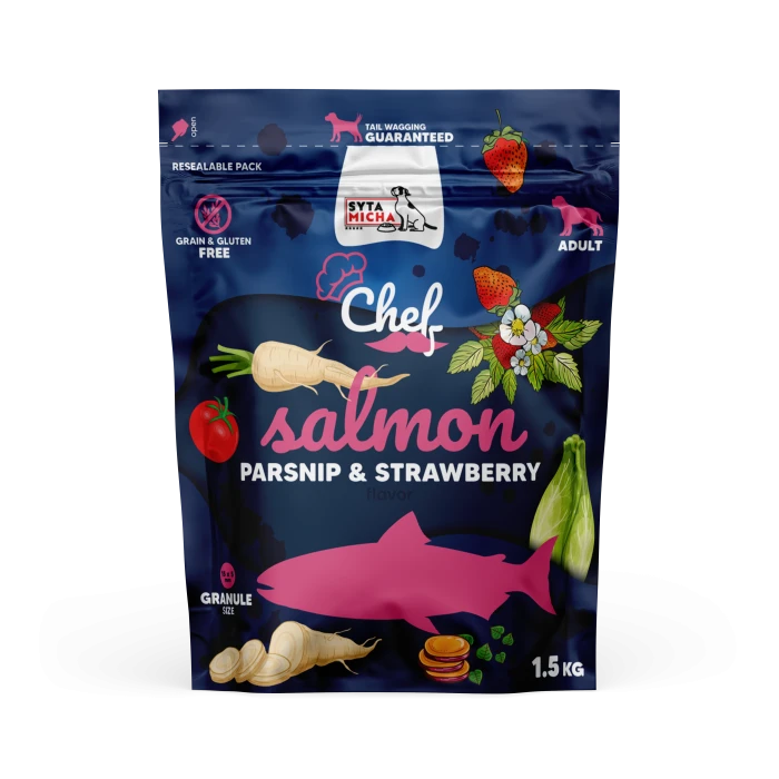 Syta Micha Łosoś, pasternak i truskawka to bezzbożowa i pełnoporcjowa formuła dla każdego dorosłego psa.