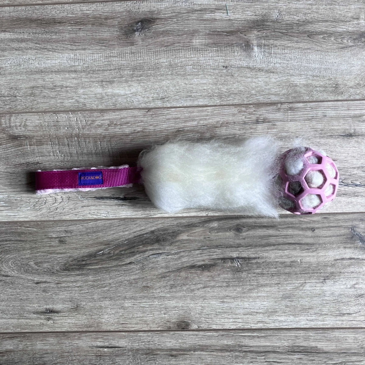 Mała zabawka z naturalnego owczego futra na krótkiej rączce bez amortyzatora z piłką Jw Pet Hol-ee Roller rozmiar S wypełniona owczym futrem.
