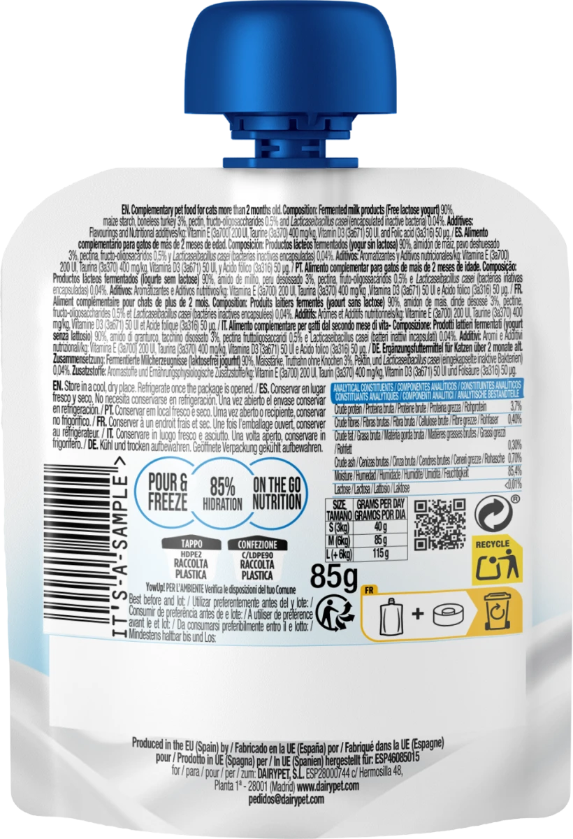 Skład: Fermentowane produkty mleczne (jogurt bez laktozy) 90%, skrobia kukurydziana, indyk bez kości 3%, pektyna, fruktooligosacharydy 0,5% i Lacticaseibacillus casei (kapsułkowane nieaktywne bakterie) 0,04%.
